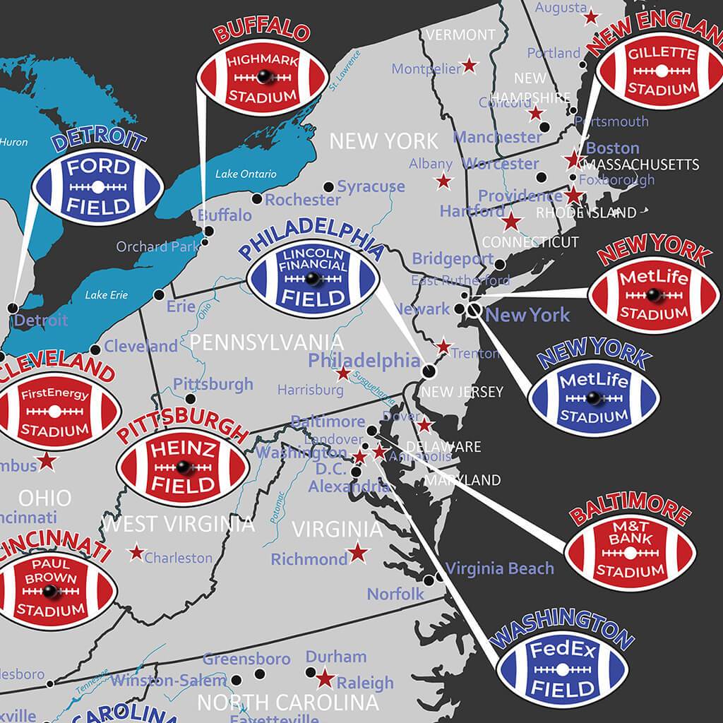 New York Football Teams Map Football Stadium Travel Map | Travel Pin Board | Push Pin Travel Maps: Every NFL team gets one bye week a season on its schedule Raiders Seattle Seahawks Arizona Cardinals Carolina Panthers New York Giants Tampa Bay Buccaneers Atlanta Falcons Buffalo Bills . The Jets traded for Reddick this offseason and he reported to the team briefly before skipping mandatory minicamp, training camp and the preseason as part of a push for a new contract his plans to .